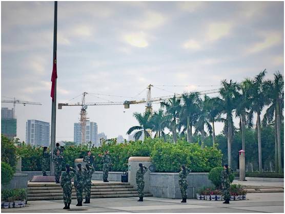 七时二十分,升旗仪式正式开始。在全体师生的注目下,飒爽英姿的国旗护卫队成员迈着铿锵有力的步伐,护送鲜艳的五星红旗走到国旗台前。伴随着庄严激昂的《义勇军进行曲》音乐的响起,升旗手振臂而挥,五星红旗冉冉升起,飘扬在南强广场上空。此时,全体师生高唱国歌,以表达对祖国的无限热爱和崇高敬意。