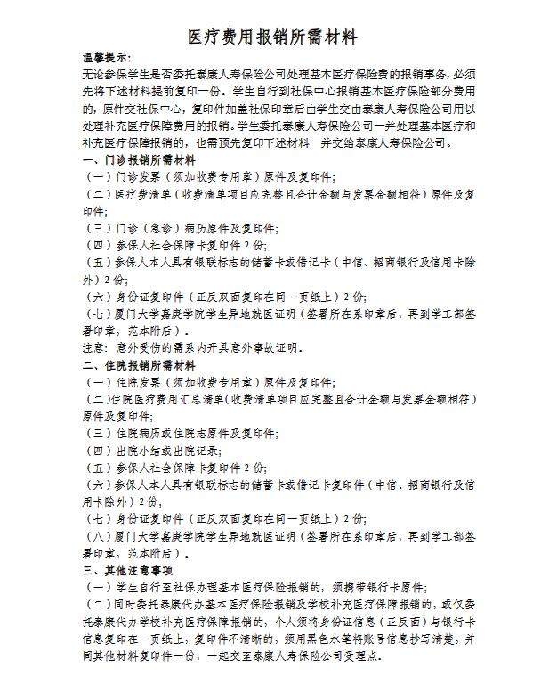 参保学生自行办理完基本医疗保险部分的报销后,将相关材料(见附件)交给泰康人寿保险公司,由泰康人寿保险股份有限公司代为办理学校补充医疗保障部分的报销事宜;或与基本医疗保险部分的报销一并委托泰康人寿保险公司办理。