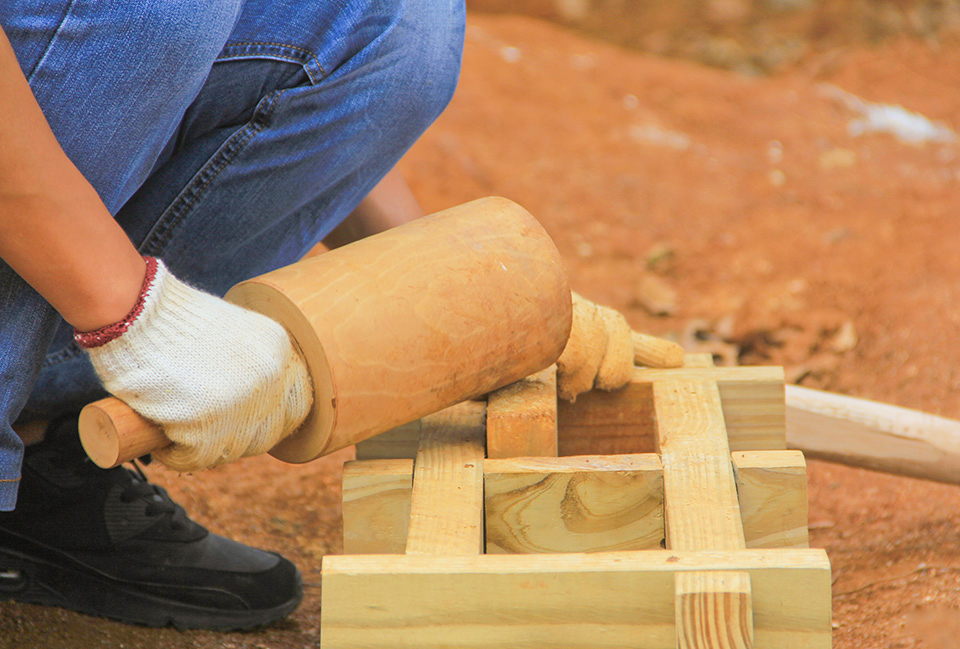 “捶打土壤时,请将锤子举高,利用重力与外力使夯土变得更容易,另外,土壤之间也会更紧密。”李鎨翰一边用手拿着夯锤捶打土壤做示范,一边向参与制作的学生讲解注意事项。不一会儿,现场交响着因捶打土壤而发出的咚咚、嗒嗒声。“当捶打声从浑浊变为清脆,则可基本判断夯土完成。”李鎨翰补充说明。