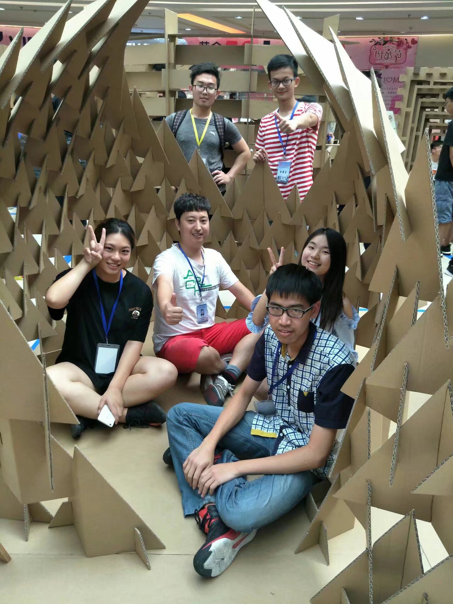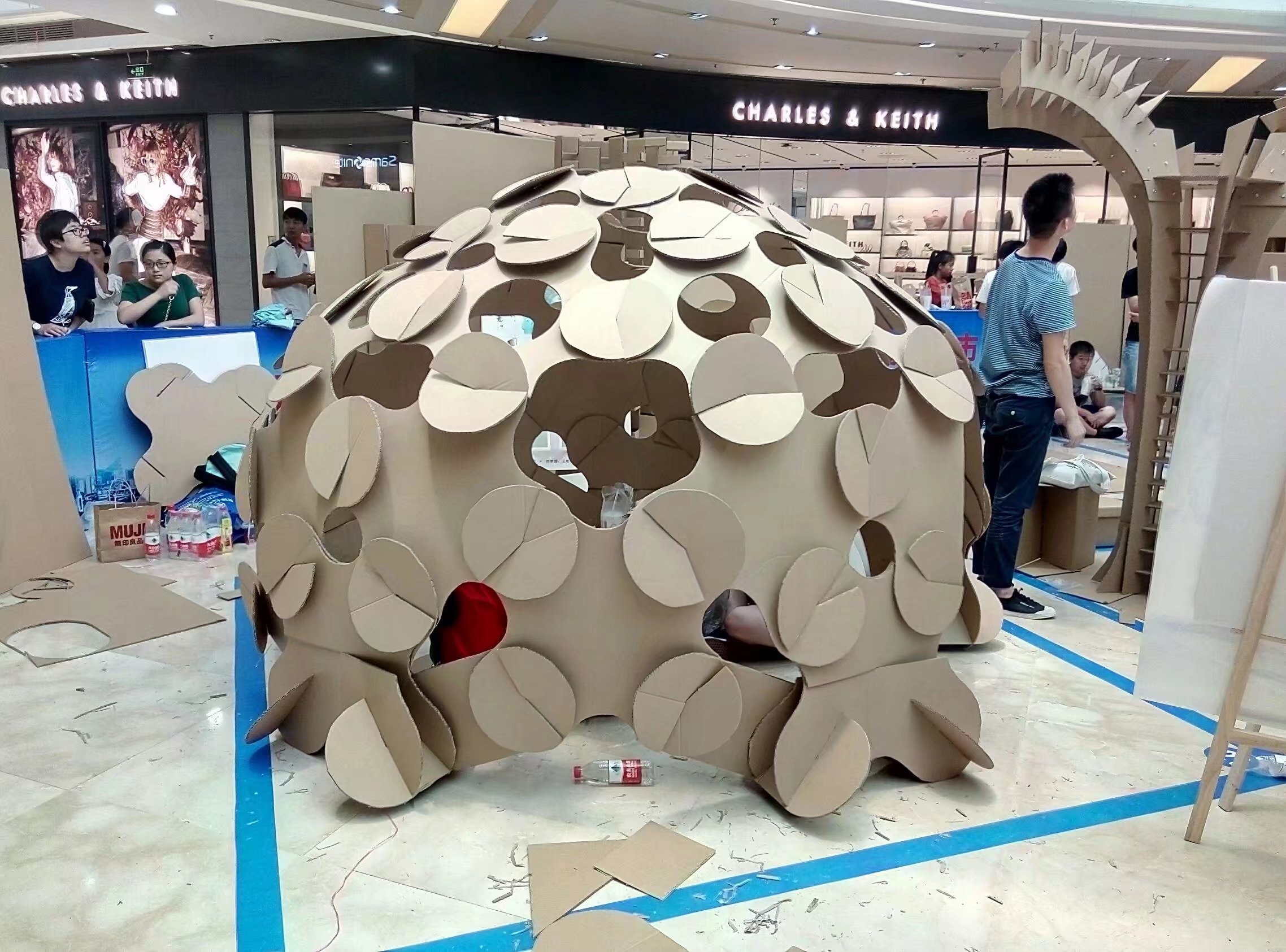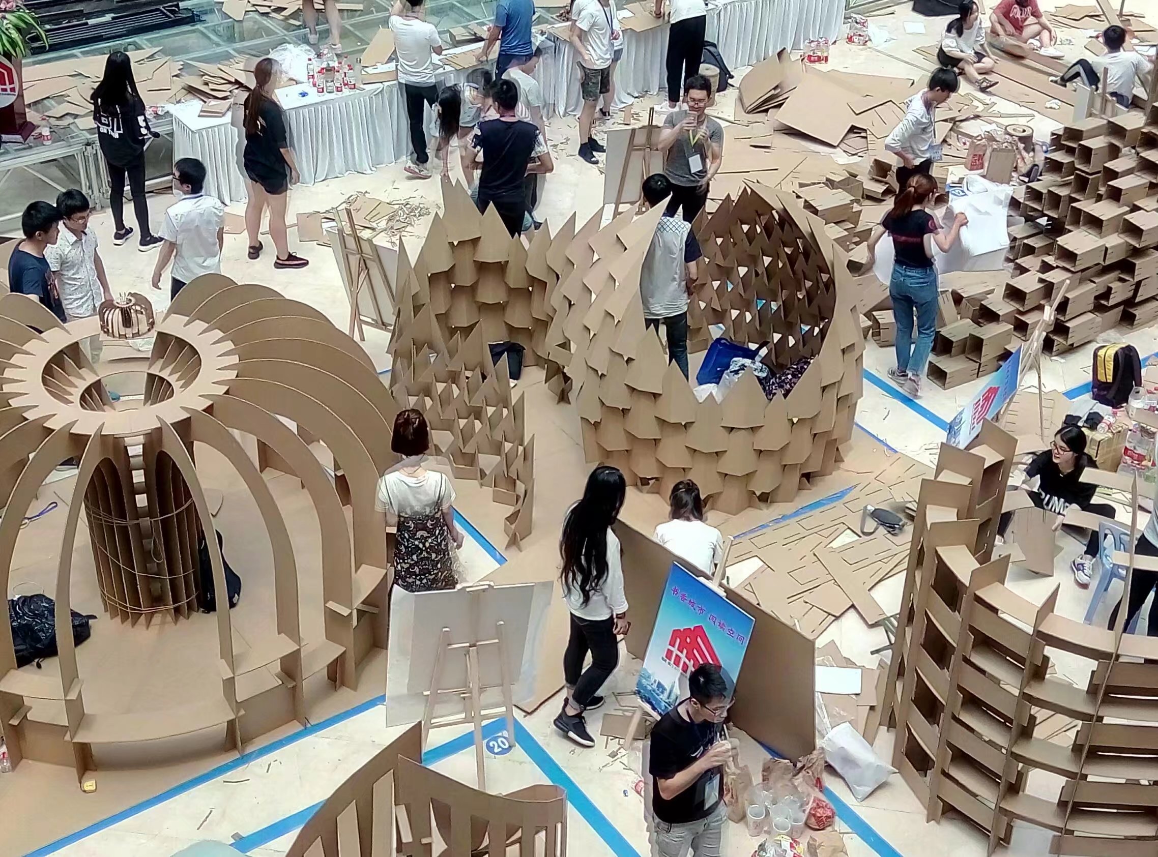 总决赛为期两天,参赛团队必须在限定的时间里,通过团队合作和自身专业能力,用不超过10张瓦楞纸,在划定的场地范围内,搭建起一座占地面积不超过9平方米的活动空间。这个“小建筑”不仅要美观、有创意,更要有防风、抗压、通风采光的功能。如何把这些实际问题在搭建过程中完美解决,对参赛团队来说是个不小的考验。