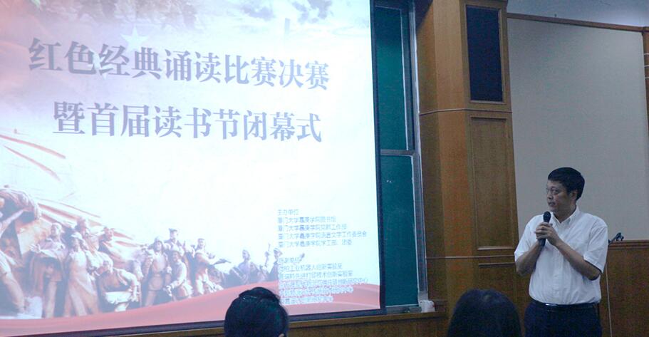 6月29日下午,由图书馆、党群工作部、学工部、团委和语言文字工作委员会联合主办的“庆祝中国共产党成立96周年‘永恒的丰碑’——红色经典诵读大赛”决赛,在人文大楼B301举行。校党委书记林辉,副院长刘暾东,人文与传播学院院长苏新春,图书馆馆长王株梅,党群工作部部长易强,学工部部长、团委书记姚祖婵,普通话测试与推广中心主任卜祥忠,音乐系教师李丽莉等出席了活动。