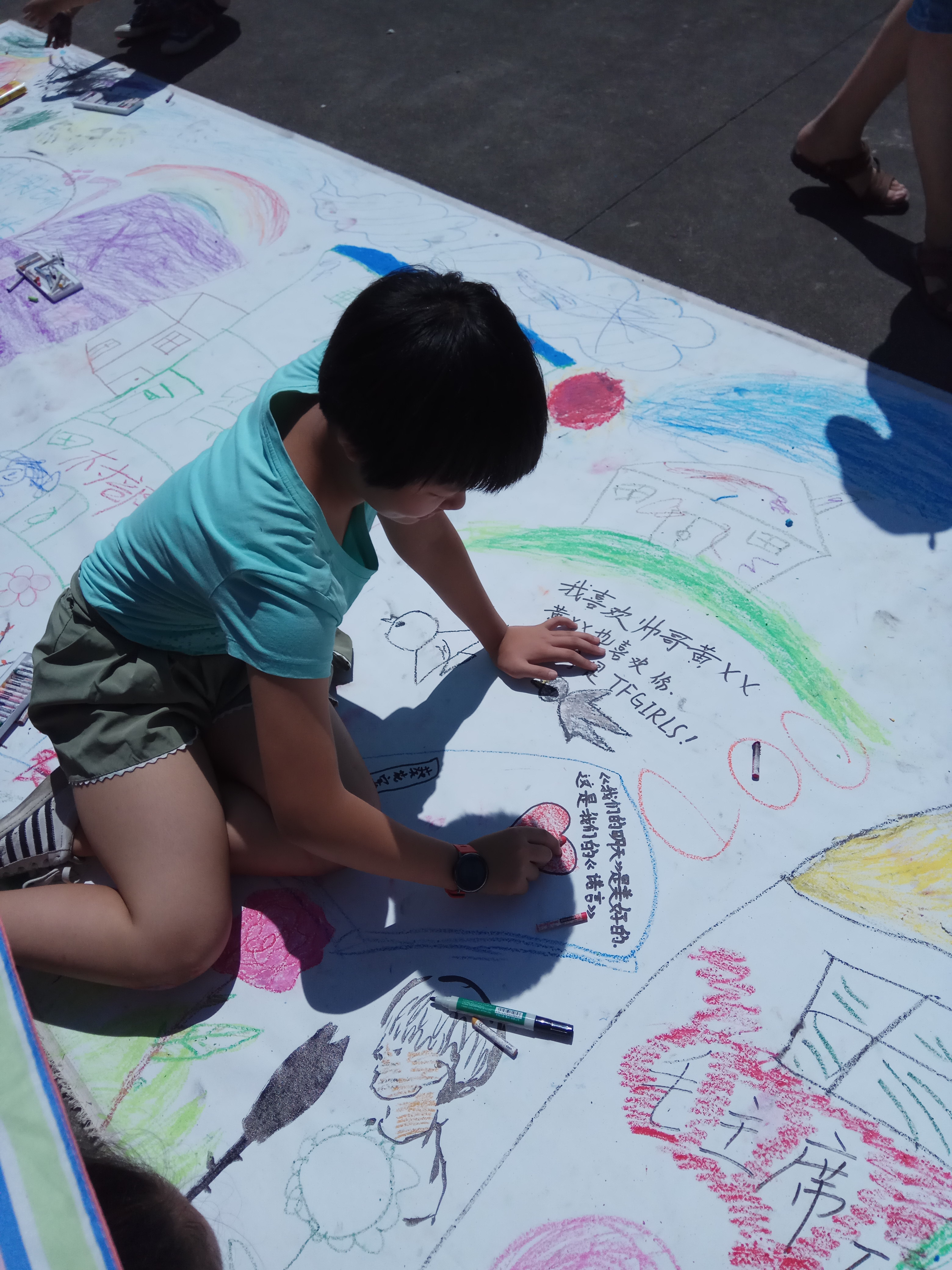 当天上午,约有60名儿童蜂拥而至参与“涂鸦”活动。在志愿者和孩子们结对之后,活动正式开始,他们利用手中的绘画工具兴致勃勃地将画布涂刷成为色彩斑斓的画作。涂鸦过程中孩子们不畏惧炎热,每一个人的脸上都洋溢着快乐的神采,期盼着能完成绘画作品,完成一个彩色的祝福与心愿。
