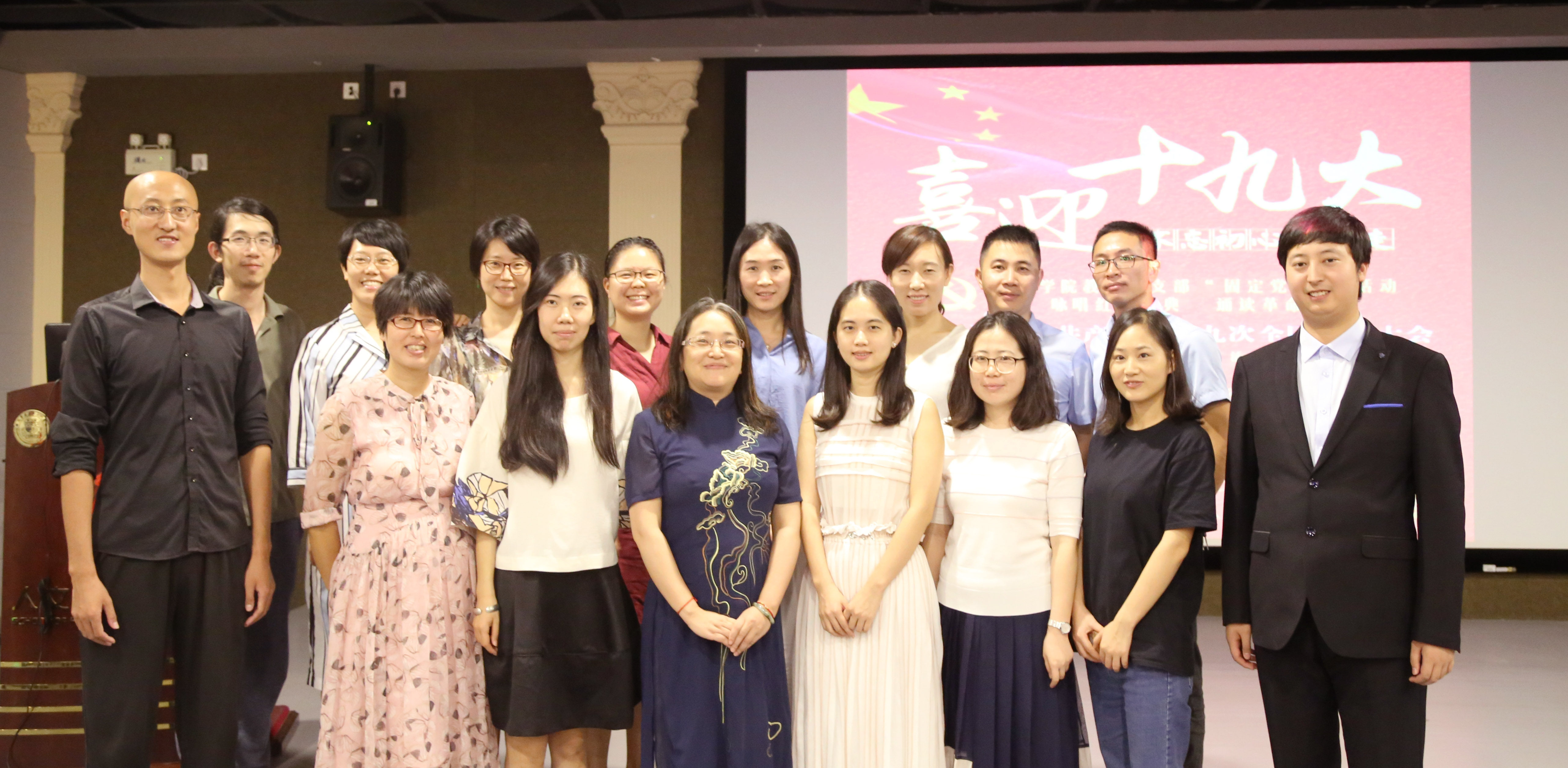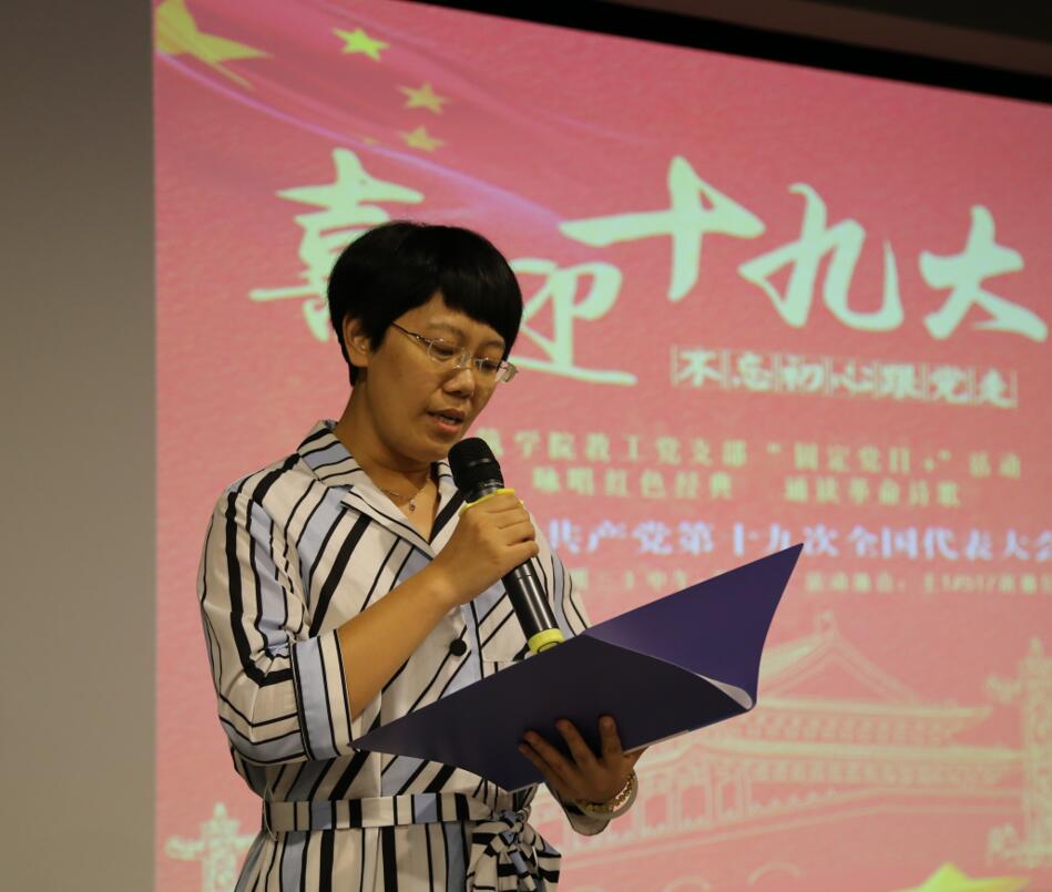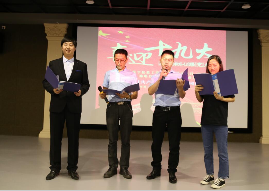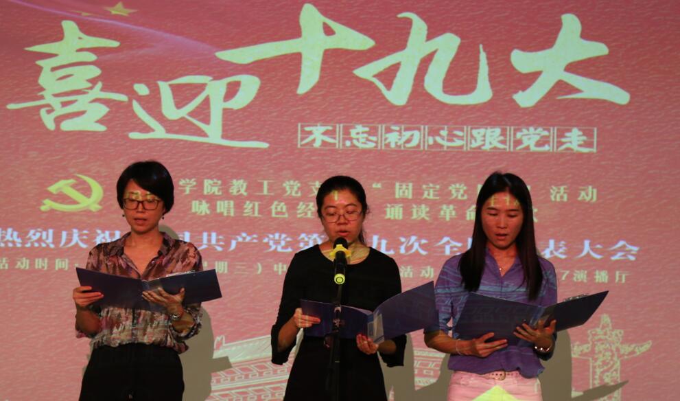 为进一步推进“两学一做”学习教育的常态化制度化,10月18日中午,我院教工党支部在主教学楼1号楼617教室,开展本学期10月“固定党日+”活动。本次活动恰逢在党的十九大召开之际,我院教工党员以诗歌朗诵的全新形式,来表达不忘初心,坚定理想信念跟党走的决心。