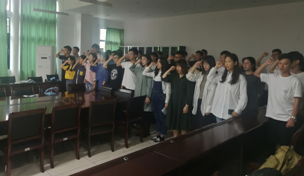 最后,饶德超老师领着十二名新进党员以及在场所有党员一起对着党旗宣誓,响亮的誓词彰显着他们坚定的信念。党支部希望新发展的预备党员能够在接下来的学习生活中严格要求自己,时刻端正自身的入党动机,牢记初心,不忘使命,充分发挥党员的先锋模范作用,做一名合格的中共党员。