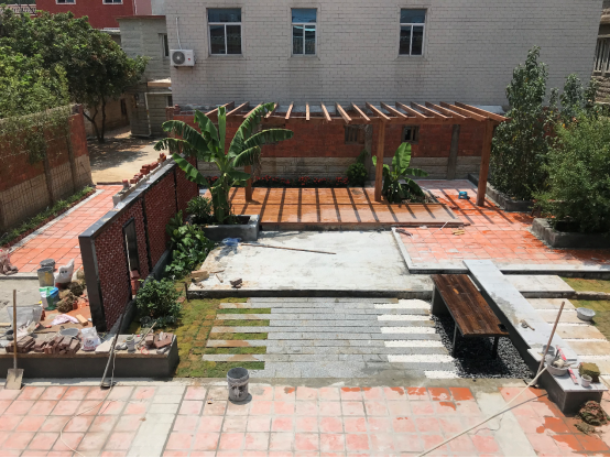 从7月中旬开始,建院师生在校开始了半个月的高强度设计,经历了概念生成、方案讨论、深化图纸到完善定稿,最终于8月1日由袁盈和杜波老师带队入驻晋江市龙湖镇内坑村。八月炎热的晋江,每天几乎都是三十几度的高温,老师和同学们坚守工地不离不弃,事无巨细地指导工人将图纸转化为建造,甚至为了施工进度能够加快,所有人都亲自动手参与劳作,最终完成了“有闲院”、“栖语台”、“逸木庭”、“篱南道”四组微景观作品。参与其中的邓同学在完成作品后,对自己的设计作品依依不舍: