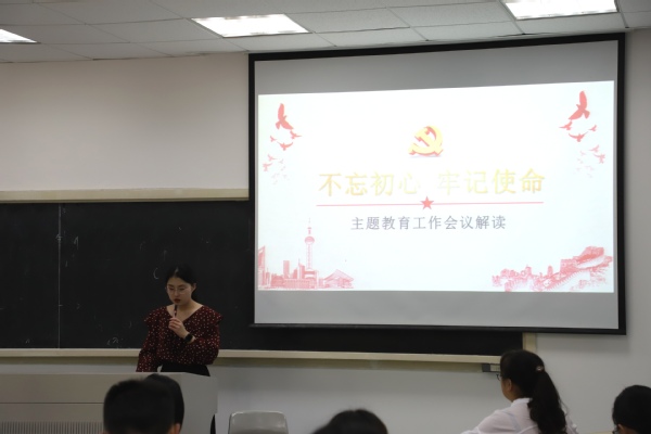 首先是金精特同学为我们阐述了“不忘初心、牢记使命”主题教育工作会议的主要内容。让大学生党员了解其重要意义及根本任务:应围绕中心,服务大众。