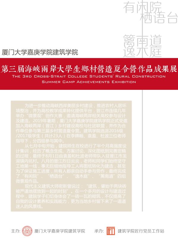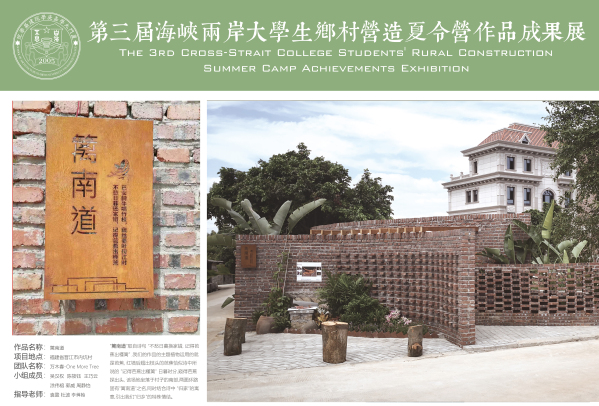 为进一步推动海峡西岸美丽乡村建设,推进农村人居环境整治,并为高校教学成果转化提供平台,晋江市连续几年举办 “微景观” 创作大赛,邀请海峡两岸相关高校参与设计及建造。2019年暑期,ylzzcom永利总站线路检测正式受邀加入海峡两岸(晋江)乡村建设高校与社团联盟,并作为合作单位参与第三届乡村营造夏令营。我院选派2016级/2017级学生(共计23人)在李鎨翰、袁盈、杜波三位老师指导下,分四组参与其中。