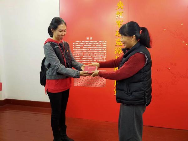 参观结束时,苏丽华老师带领全体人员参与参观学习挑战答题取得满分,获赠了馆内纪念小礼物“小红本”。