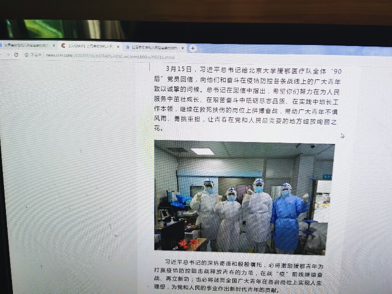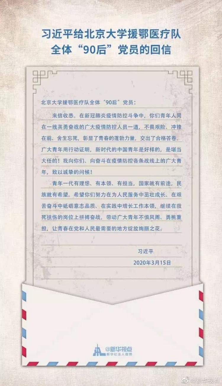 中共中央总书记、国家主席、中央军委主席习近平3月15日给北京大学援鄂医疗队全体“90后”党员回信,向他们和奋斗在疫情防控各条战线上的广大青年致以诚挚的问候,并寄语广大青年不惧风雨、勇挑重担,“让青春在党和人民最需要的地方绽放绚丽之花”。习近平总书记的回信在我院青年当中引起了热烈反响: