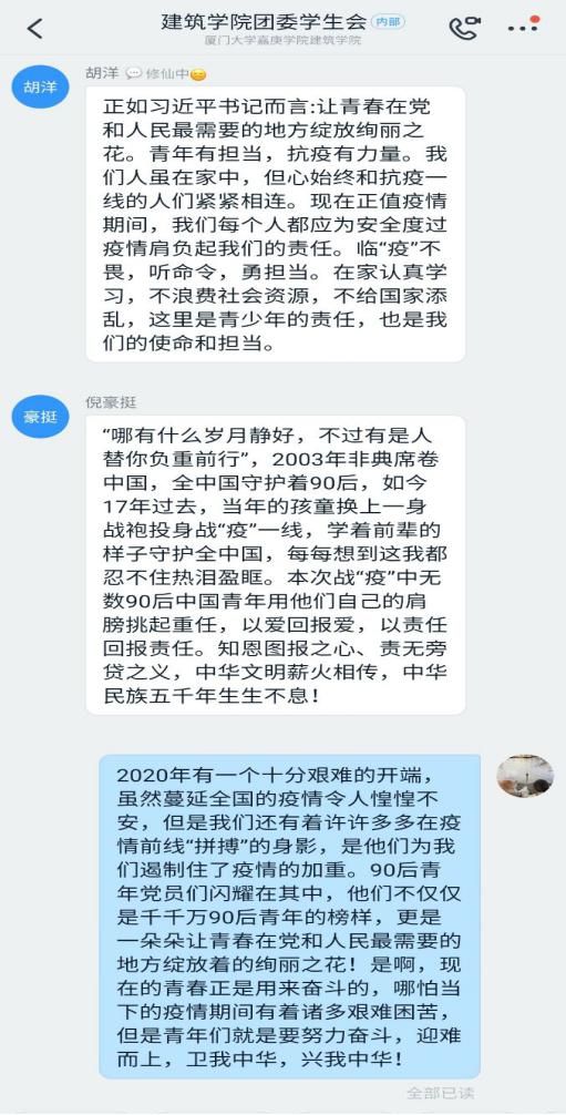“病毒会被隔离,但爱不会被隔离”,当灾难降临,人性中最美好的一面,总会为疲惫绝望的众生注入坚持向前的勇气。作为新时代的新青年,我们应积极响应习主席的回信精神,将这份爱与信念,投入到对抗病毒和今后的学习中去。