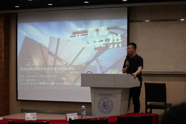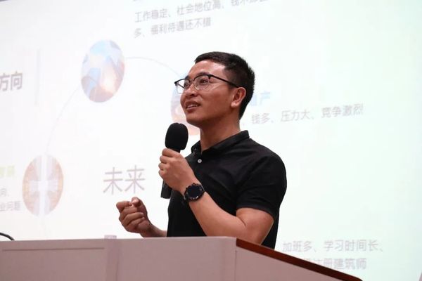 在周忠长老师的主持下,此次培训拉开序幕。一开始涂文锴先生便提到,这次培训有两个主题,一个是“紧跟行业步伐,点亮建筑人生”,另一个是“正青春,一起拼”。首先,他向大家介绍了福州地区和厦门地区的土拍情况,通过介绍地产排名给大家分析了5个就业方向:国企、考公,房地产,设计公司,施工、监理单位,出国深造、考研。并分别介绍了每个方向的利弊。紧接着又向大家介绍了设计机构、设计师的发展方向、建筑师注册考试、地产对设计院的要求、未来建筑的发展方向以及设计院的组织架构。