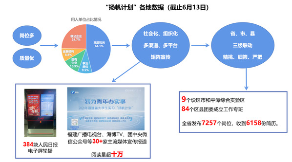 “扬帆计划”工作开展以来,共青团福建省委通过一文件、一库、一平台、一导师、一封信、一激励、一活动,深入推进各项工作。一文件指的是联合省教育厅、省财政厅、省国资委、省工商联、福建银保监局、省委人才办共同下发《关于开展2021年福建省大学生实习“扬帆计划”的通知》,明确工作目标、职责分工、工作内容和时间节点;