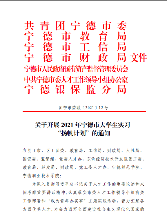 《关于开展2021年福建省大学生实习“扬帆计划”的通知》下发以来,各级团组织高度重视相关工作,9个设区市团委和平潭综合实验区团委、84个区县团委成立工作专班,为全省“扬帆计划”的顺利实施提供了强有力的组织保障。
