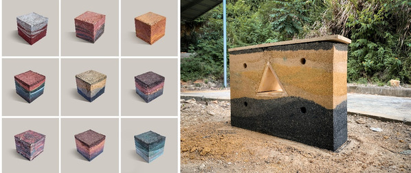 图2我制作的生土块作品及主持设计的现代彩色夯土墙