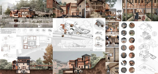 在后期绘制图纸阶段,我们找了大量国内外竞赛获奖作品作为版面参考,主要分为拼贴风、插画风、写实风,鉴于此次竞赛落地性较强,我确定了图纸的大概基调为写实风格,色调以暖色调为主,然后根据设计要点计算需要制作效果图的数量,其中包含大图及小图,还要注意每张效果图的风格和色调要保持一致,最后其他分析图我选择以线稿的形式表现,整体版面就不会显得杂乱,需要注意的是,在图纸排版上一定要遵循对比、重复、对齐和亲密性四条基本原则。