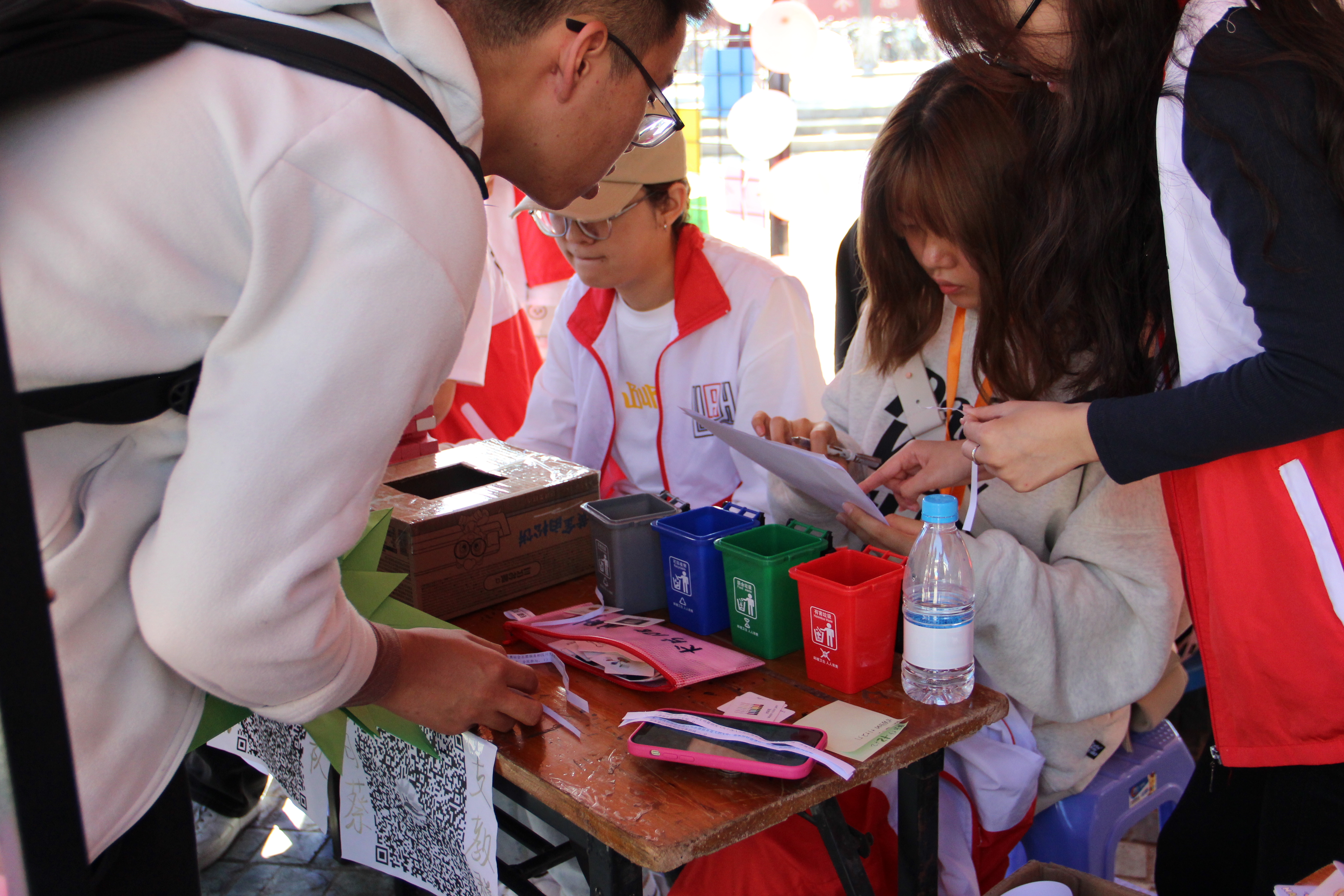 我院在现场布置了三个区域分别为展示区、体验区和游戏区。展示区内有我院“向日葵”农村小学艺术培训计划和2023年度志愿服务活动的风采展示;体验区内设有折纸、落叶拼贴画、爱心明信片祝福和树叶书签制作等多个志愿服务项目体验;游戏区内设有志愿服务知识竞赛、垃圾分类小游戏和层层叠等多个有趣的游戏环节。参与者可以在体验区、游戏区的活动中获得积分,并根据积分兑换相应的小礼物。