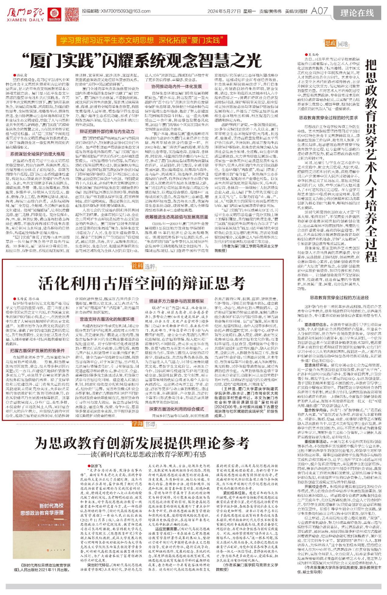 《厦门日报》刊发我院王梓晨老师理论文章《活化利用古厝空间的辩证思考》