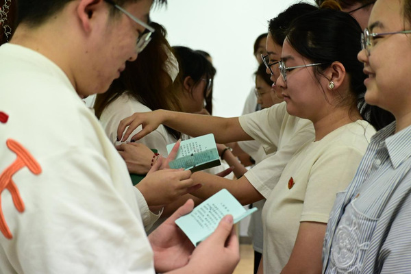随后各班团支部书记为新团员的颁发团员证和团徽,象征着新团员们正式成为共青团的一员。团员证和团徽不仅代表了荣誉,更是责任与使命的象征,提醒新团员们要不忘初心,牢记使命,为担当民族复兴大任不断努力。
