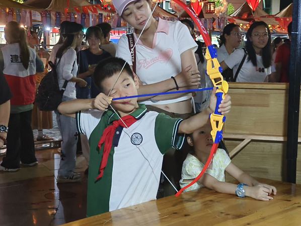 活动现场,十四个匠心独运设计的互动游戏,宛如一幅生动的跨越千年的民俗历史画卷。投壶、射箭、蹴鞠、捶丸、猜灯谜等传统游戏竞相登场,它们不仅是一个考验参与者智慧与勇气的游戏,更是中国千年优秀传统文化的生动写照。