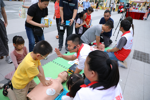 活动当天,志愿者们早早到达现场,协助工作人员布置场地、准备物资,并在活动中引导孩子们参与各项趣味游戏和生命教育体验项目。结绳小课堂传授实用绳结技巧,亲子讲学环节以互动形式普及安全知识,“防溺一夏”专题讲解结合情景模拟强化防溺水意识,户外安全小课堂通过案例剖析提升风险预判能力。同时,志愿者们借助AED设备与模拟教具,演示海姆立克急救法操作流程与心肺复苏按压标准步骤,并开展手部腿部包扎等创伤救护教学,指导家长与孩子们进行实操练习。