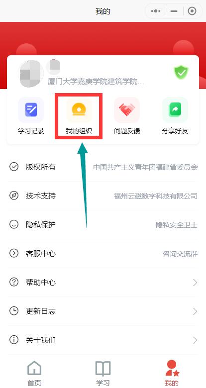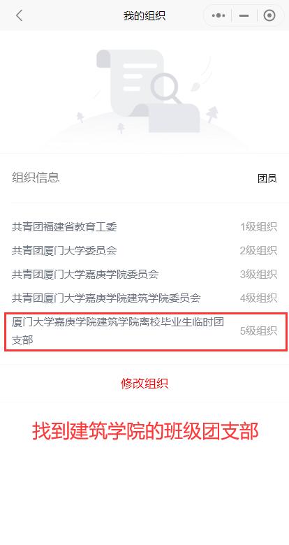 登录“福建青年大学习”微信小程序——我的——我的组织——逐级选择,找到班级团支部(前面的组织参照下图)